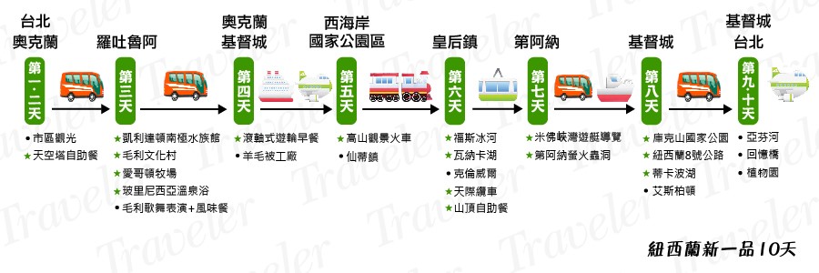 行程: 紐西蘭當地如遇洪水、大雪、雷雨等氣候因素,導致行程受影響,基於旅客生命安全以及團體操